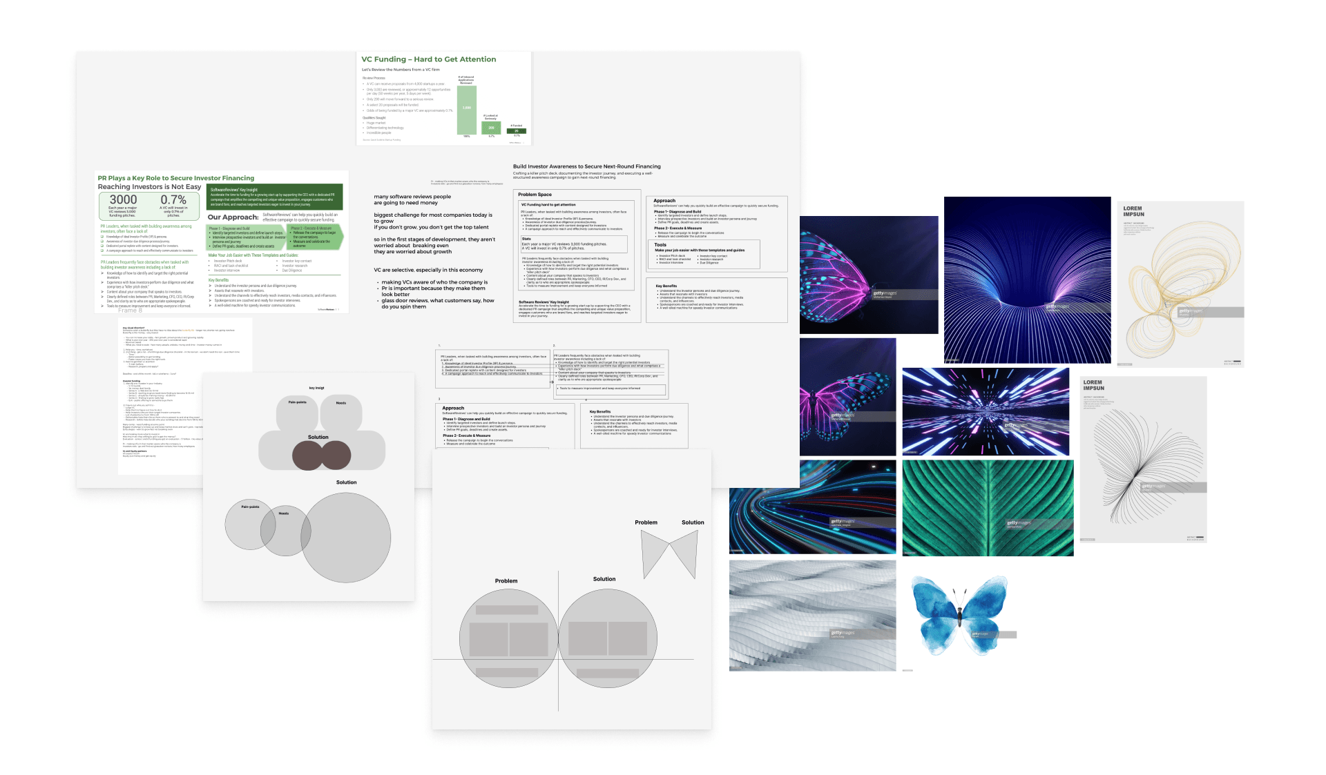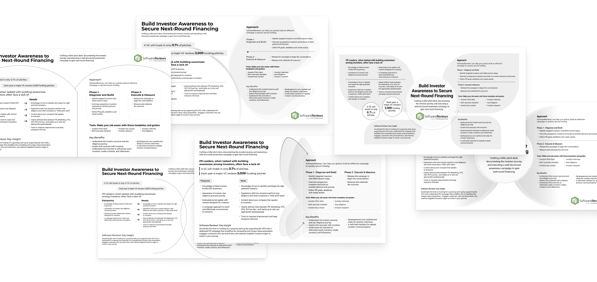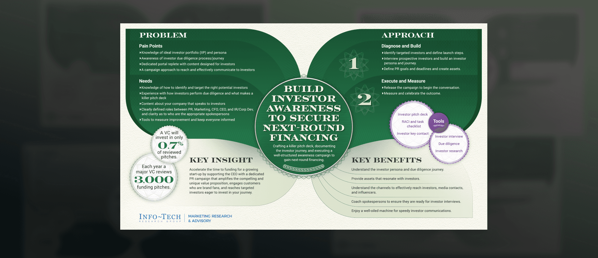 This project visualizes complex research and strategic insights in a single-page infographic accessible to both members and potential clients. The case study, “Build Awareness to Secure Investor Financing,” was used as the featured example.