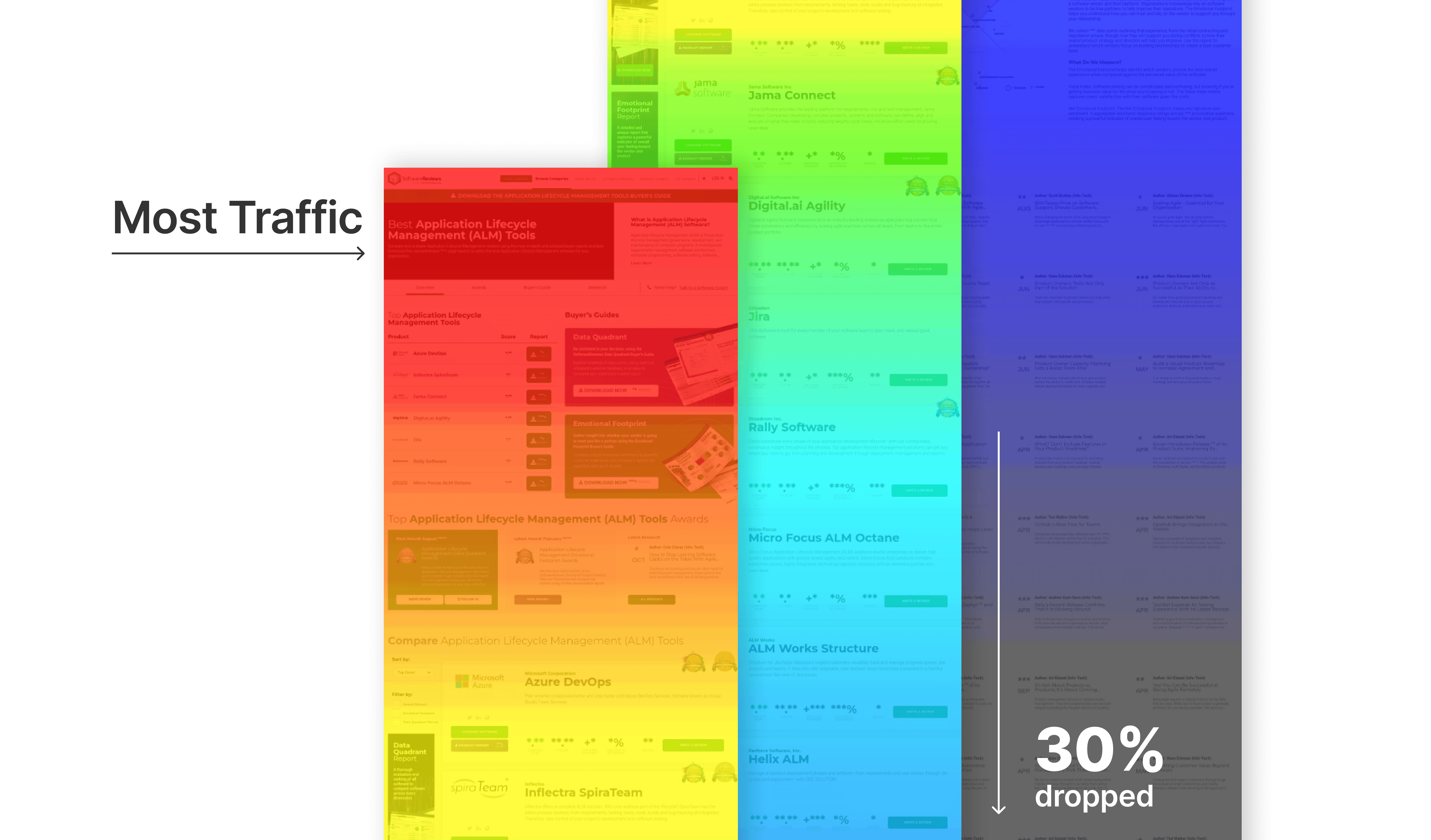 Since this is a new platform within SoftwareReviews, we drew on pain points and UX findings from the main site as our primary research input. Based on the heatmaps collected from the main site, we found that around 70% of users only browse the top third of a page; engagement then drops to ~30% by the two-thirds mark and continues to decline. As a result, we set the following design directions for the next steps: