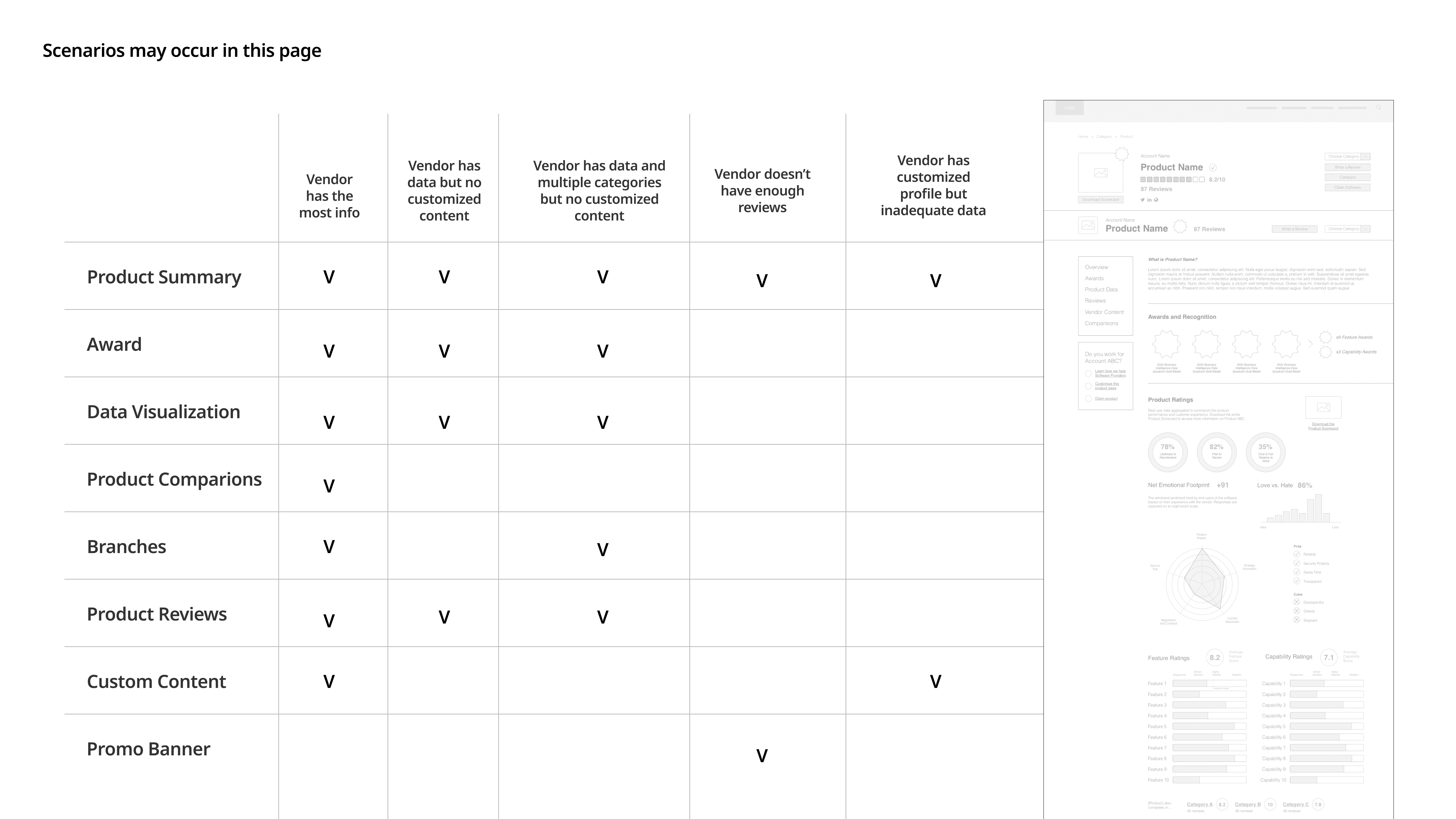 To align all pages with stakeholders, we started by understand all scenarios may show on this page, then translated the content into mid-fidelity wireframes and built a prototype to provide a quick, end-to-end view of the experience. Based on the requirement, we would like to adjust features and content to this page:
