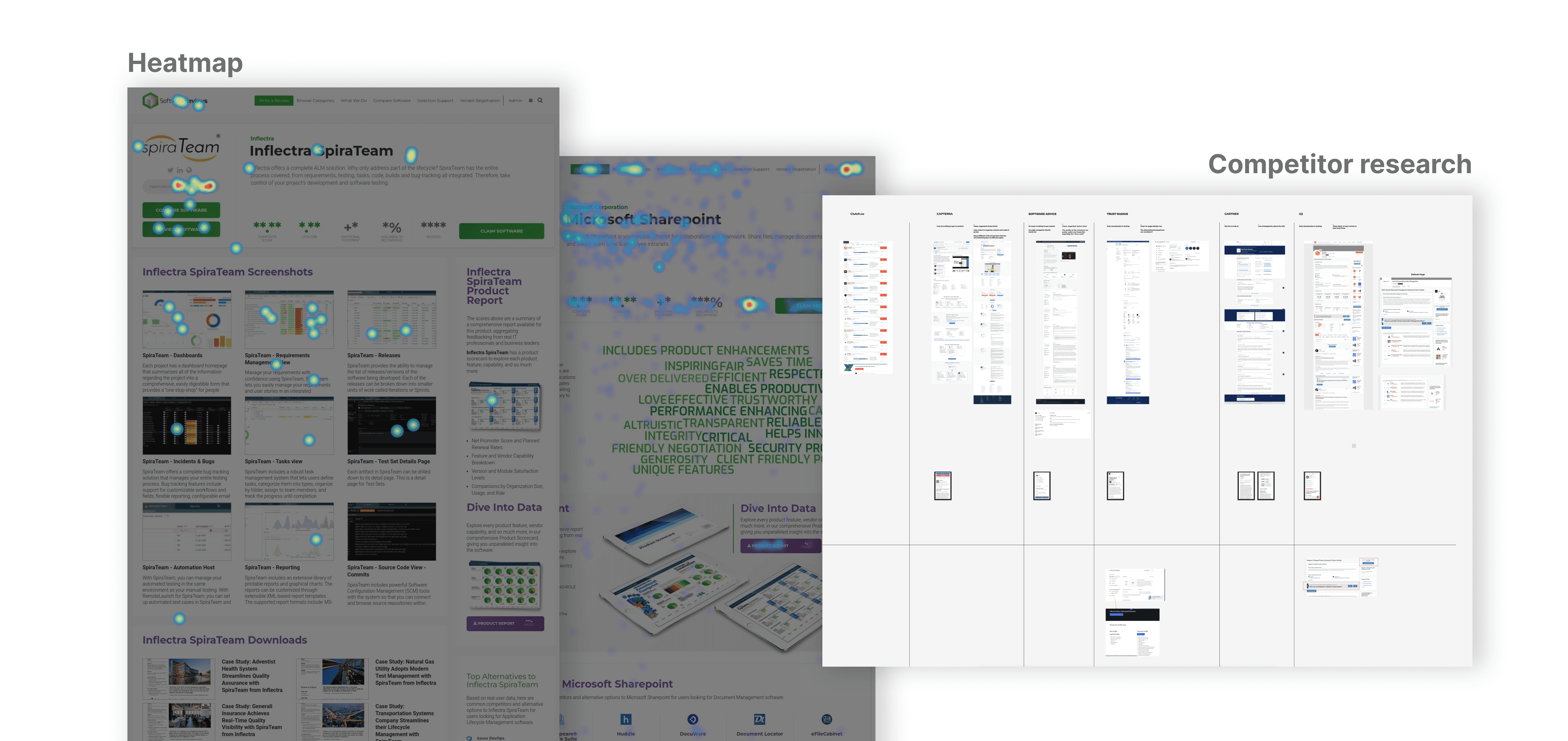In this phase, we used competitor research (including Capterra, G2, Software Advice, Trust Radius and Gartner) and heatmap to identify the pro and cons of the product page on competitor' sites and our site. The UX findings are gathered as below: