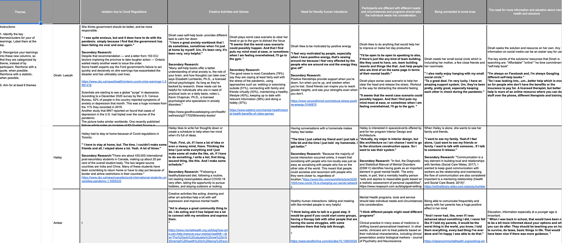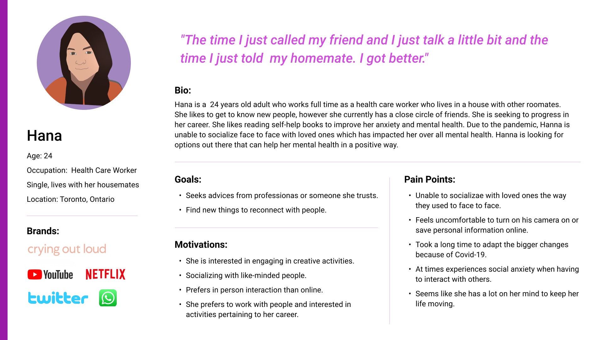 To understand individuals' current journeys in the post-pandemic, we looked for three young individuals in their 20s who currently live in Toronto. Our team then generated a semi-structured discussion guide for their interview. The discussion guide focused on their experience of dealing with their mental health during the pandemic.
