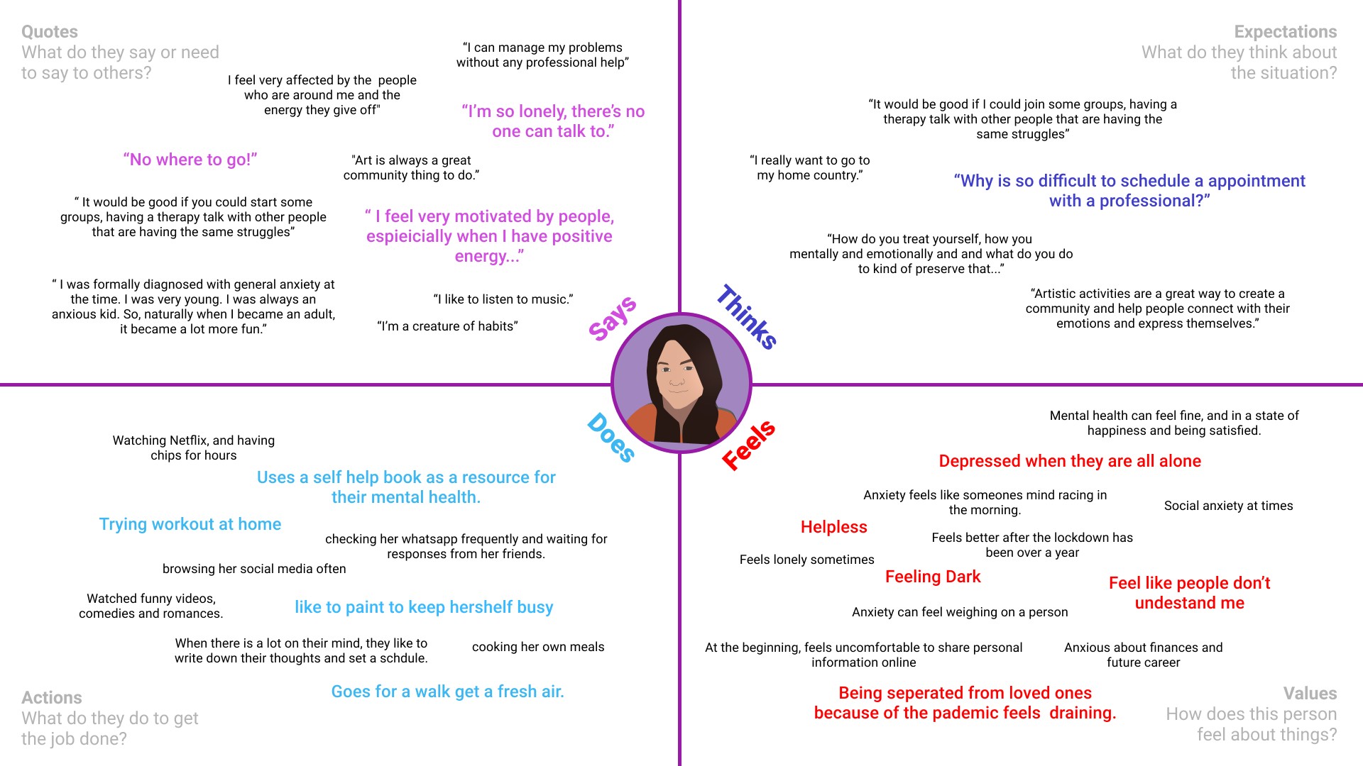 We used an empathy map to include main insights and observations from our target audiences. Through this diagram, we had an in-depth understanding of their behaviours and emotions on their mental health.