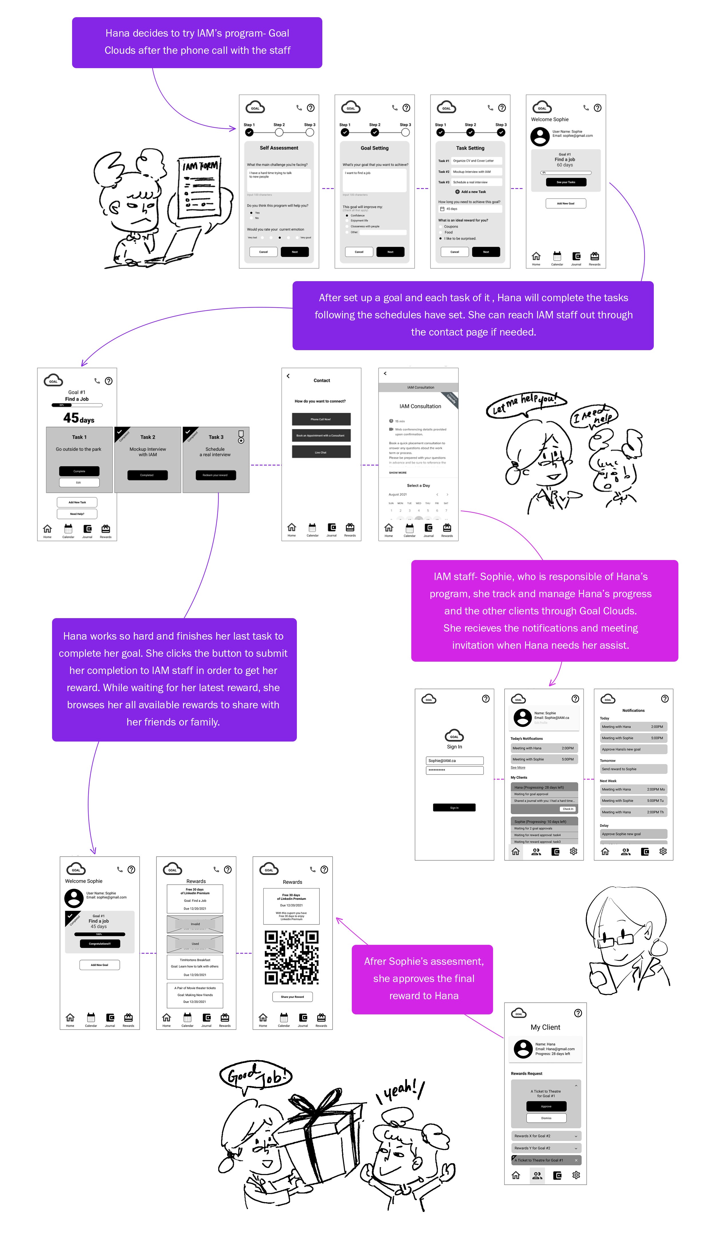 In the post-pandemic, many individuals are struggling to recover their mental health with IAM because everything goes online. We designed a platform to help IAM clients to manage and track their process in order to achieve their goals step by step. Besides, IAM staff can manage their clients' projects on their end through this platform in the meantime.