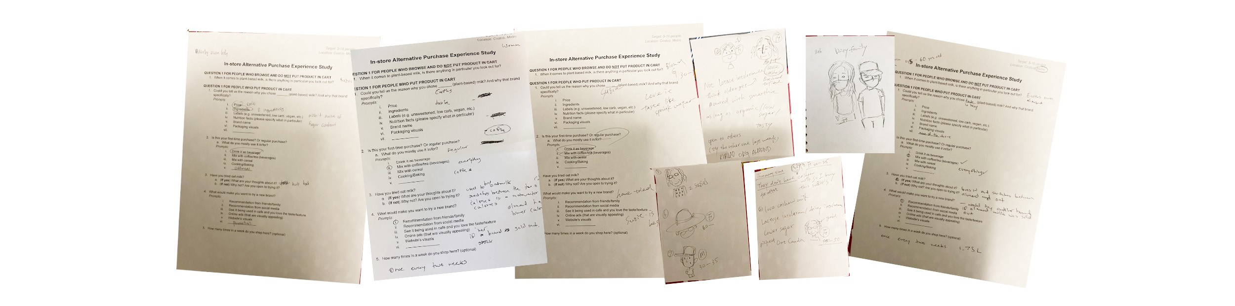 On the other hand, we also created a concise script with 5 main questions for the in-store version. We chose one of Costco locations in the Toronto area, and asked 10 customers who picked alternative milk products about their in-store aisle experience and observed their behaviours.