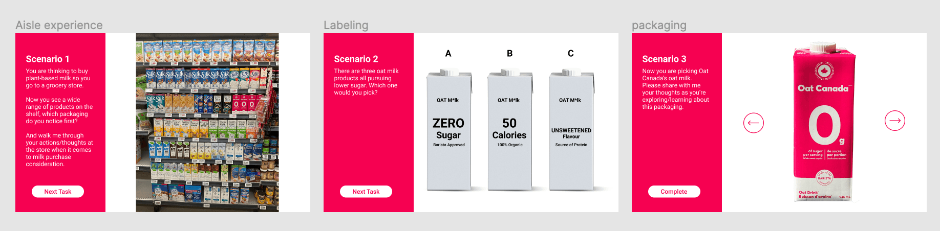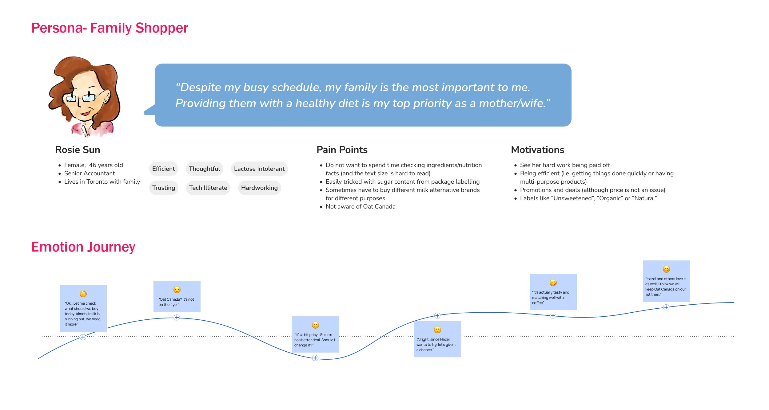 In this part, the team conducted the usability testing for Oat Canada's website and oat milk packaging. Based on the personas, we looked for 6 different types of milk consumers. Additionally, I created 3 tasks for packaging to understand their aisle experience and opinion on labeling.