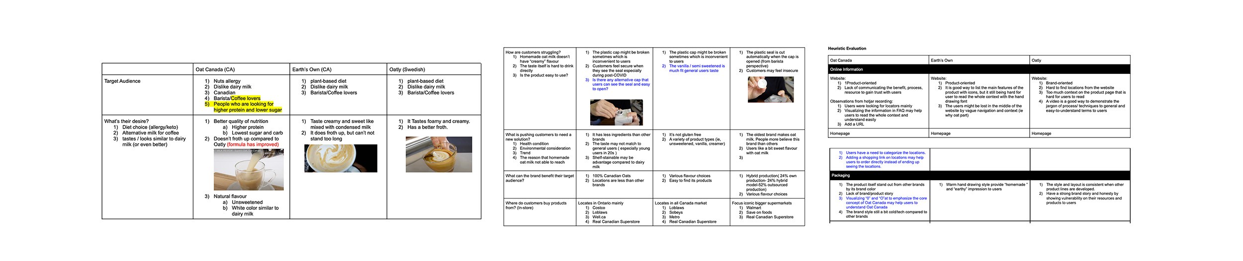 Through this method, we not only gathered data and analyzed with criteria including JTBD, Heuristic Evaluation, target audience, etc. Additionally, we also analyzed the oat milk product review videos and Hotjar videos for the company website.